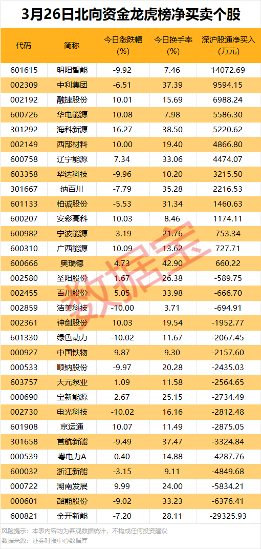 机构净卖出个股中,明阳智能遭机构净卖出12.18亿元,居首;紧随其后是华达科技,净卖出金额为2.49亿元。