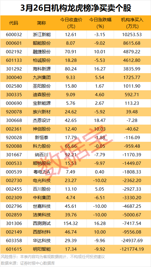 今日龙虎榜中,净买入个股有10只,净卖出的个股为16只。7股净买入金额均超1000万元,浙江新能获机构净买入1.03亿元,居首;其次是韶能股份、融捷股份、柏诚股份,机构净买入金额均超4000万元。
