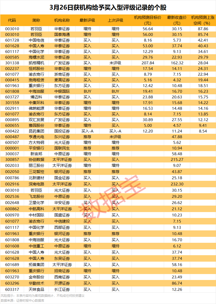 若羽臣上涨空间最高,3月26日华泰证券预计公司目标价为56.64元,上涨空间达87.86%;上涨空间较高的个股还有中国电信、中国人寿,分别为42.41%、40.43%。