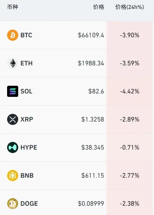 截至发稿,比特币跌近4%逼近66000美元,以太坊跌超3.5%。
