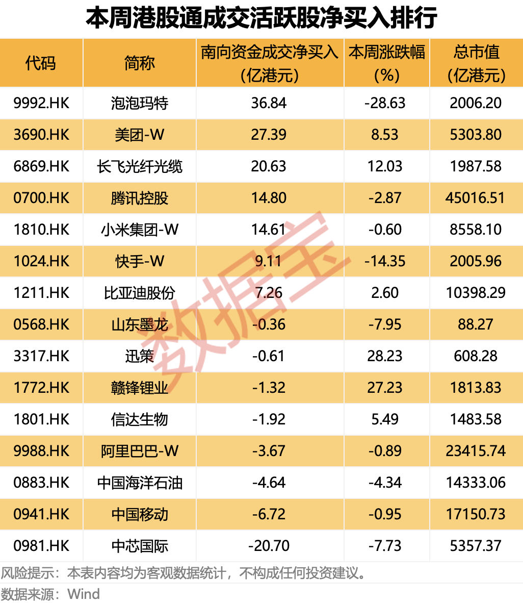 从成交净买入金额来看,本周泡泡玛特获南向资金净买入金额最高,达到36.84亿港元。南向资金对互联网巨头以净买入为主,美团-W获南向资金净买入27.39亿港元,腾讯控股、小米集团-W本周获南向资金净买入金额超过14亿港元。