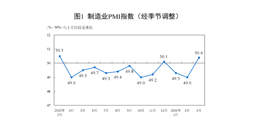 人民财讯3月31日电,据国家统计局,3月份,制造业采购经理指数(PMI)为50.4%,比上月上升1.4个百分点,高于临界点,制造业景气水平回升。