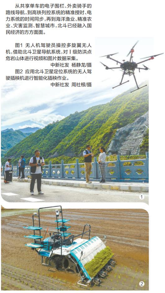 北斗还赋能了海洋渔业、农业等。目前,全国超过80万艘渔船安装了北斗终端。台风来临时,渔政部门通过北斗短报文向海上渔船群发预警,渔民也通过北斗报告自己的位置;在黑龙江建三江,通过北斗导航,无人驾驶插秧机显著提高了自动种植水平,带动当地农作物产量提高5%以上。在灾害预测方面,利用北斗高精度定位可监测地壳形变、山体滑坡等,结合北斗短报文在通信中断时的应急通信能力,构成了“监测+预警+应急通信”三位一体的防灾减灾体系。