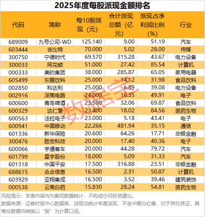 派现公司中,每10股派现金额在10元以上的有55家,每10股派现金额最高的是九号公司-WD,公司拟每10股派现金额为125.14元;其次是吉比特、宁德时代等,每10股派现金额分别为70元、69.57元。
