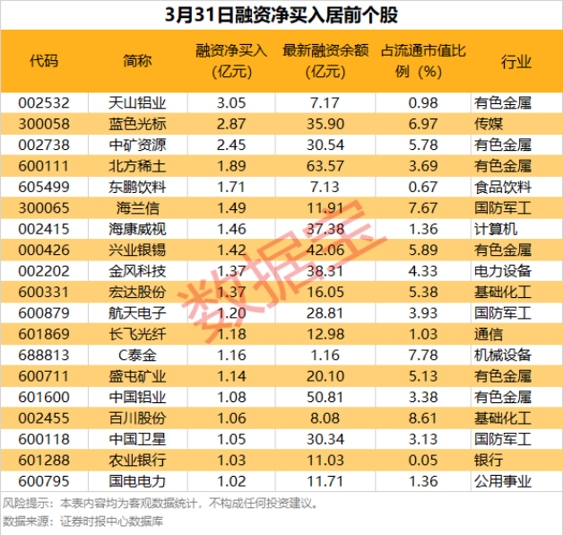 具体到个股,3月31日共有1451只股获融资净买入,净买入金额在千万元以上的有340只,其中19只融资净买入额超1亿元。天山铝业融资净买入额居首,当日净买入3.05亿元;其次是蓝色光标、中矿资源,融资净买入金额分别为2.87亿元、2.45亿元;融资净买入金额居前的还有北方稀土、东鹏饮料、海兰信等。