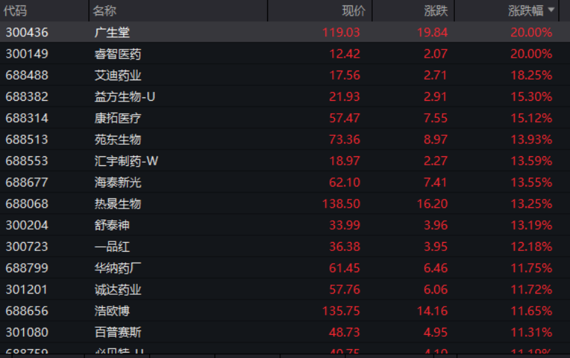 主要行业板块和赛道方面,若按照申万一级行业划分,医药生物板块领涨,板块涨幅超过3%,个股盘中大面积涨停。其中睿智医药、广生堂20%涨停,另有多股涨停或涨幅超过10%。