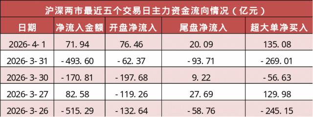 今日沪深两市主力资金开盘净流入76.46亿元,尾盘净流入20.09亿元,两市全天主力资金净流入71.94亿元。