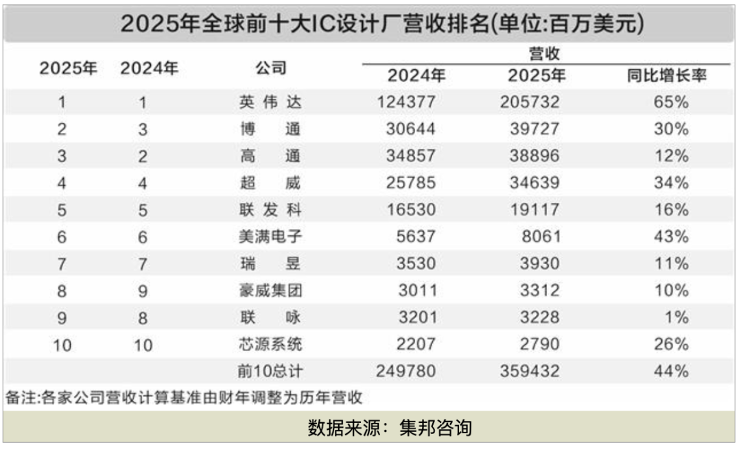 受人工智能(AI)浪潮推动,全球前十大芯片设计企业营业收入水涨船高。据统计,2025年全球前十大IC设计公司合计营收超3594亿美元,同比增长44%,英伟达蝉联营收冠军,博通反超高通成为第二名。另外,A股IC设计龙头豪威集团排名提升至全球第八名。