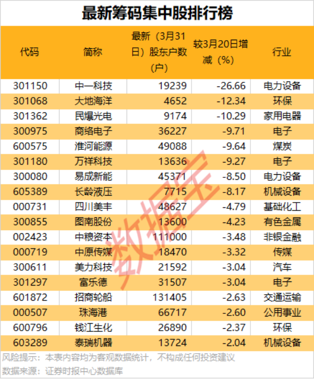 股东户数降幅最多的是中一科技,截至3月31日最新股东户数为19239户,较3月20日下降26.66%;大地海洋、民爆光电股东户数环比分别下降12.34%、10.29%。