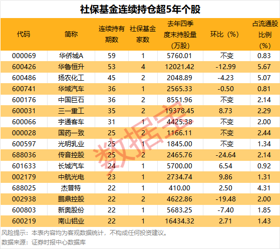社保基金持有期限最长的个股是华侨城A,自2011年二季度以来已累计持有59个季度,最新全国社保基金四一三组合,位列公司第六大流通股东,持股量合计为5760.01万股,占流通股比例为0.83%,社保基金持有期限较长的还有华鲁恒升、扬农化工、中国巨石等,已连续持有53、45、36个季度。