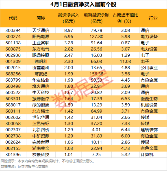 具体到个股,4月1日共有1838只股获融资净买入,净买入金额在千万元以上的有439只,其中21只融资净买入额超1亿元。天孚通信融资净买入额居首,当日净买入8.97亿元;其次是阳光电源、工业富联,融资净买入金额分别为6.96亿元、3.28亿元;融资净买入金额居前的还有东方电气、鹏鼎控股、德明利等。