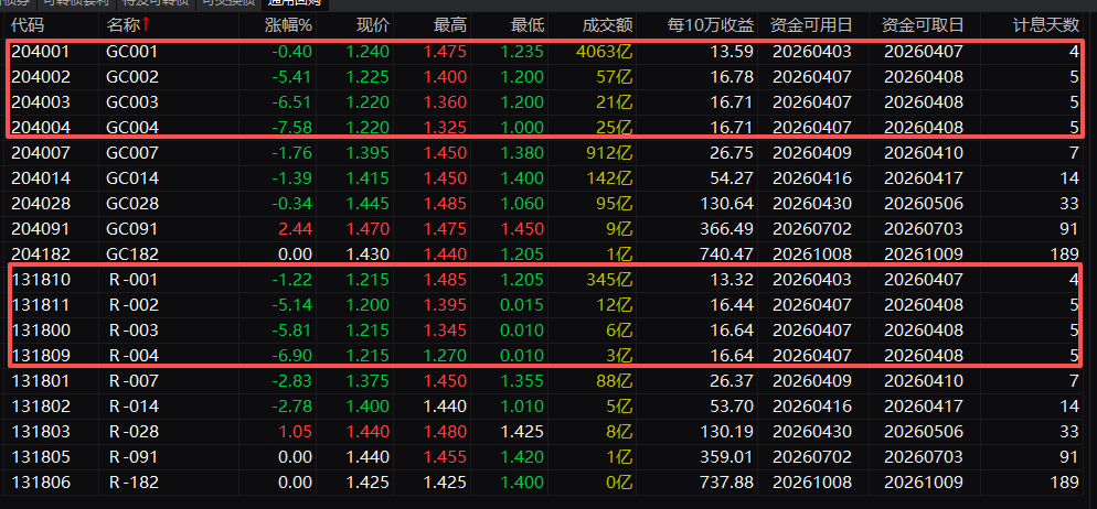 值得注意的是,如果等到明天(4月3日)再去操作交易所国债逆回购,1天期、2天期、3天期、4天期等短期限国债逆回购品种计息天数均将仅有1天,在计息天数上将非常不划算。