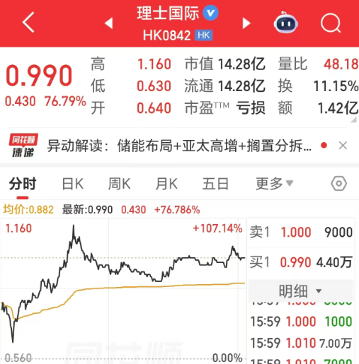 4月1日晚间,理士国际(00842.HK)公司宣布终止LeochEnergyInc.分拆赴美上市计划,4月2日股价应声暴涨,单日涨幅达76.79%,收报0.99港元,市值回升至14.28亿港元,成为市场焦点事件。