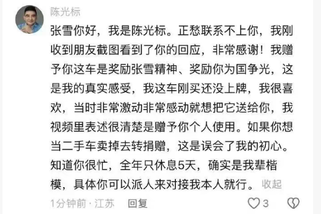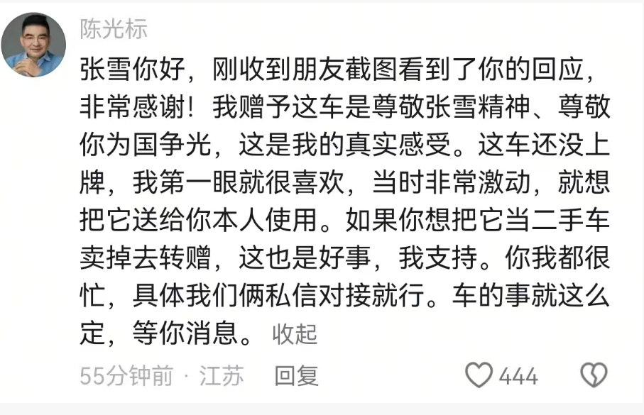 在该内容下的评论中,张雪也频频与网友互动。就在4月2日,陈光标也在该内容下发表评论。“我赠予这车是尊敬张雪精神、尊敬你为国争光,这是我的真实感受。”陈光标称,“这车还没上牌,我第一眼就很喜欢,当时非常激动,就想把它送给你本人使用。如果你想把它当二手车卖掉去转赠,这也是好事,我支持。你我都很忙,具体我们俩私信对接就行。车的事就这么定,等你消息。”