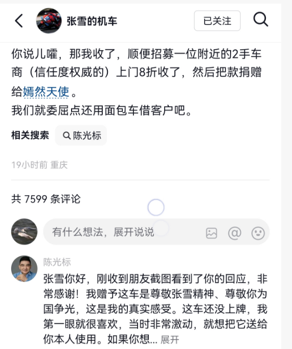 在陈光标发布该视频后,张雪实名认证的账号“张雪的机车”回应称,“那我收了,顺便招募一位附近的2手车商(信任度权威的)上门八折收了,然后把款捐赠给嫣然天使。”他进一步表示,“我们就委屈点,还用面包车借(注:应为接)客户吧。”