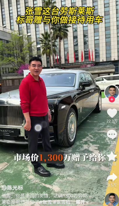 “张雪,你好,我是陈光标。你太牛了!带着中国机车在世界顶级赛场连续拿了两个冠军,打破了国外几十年的垄断,这是咱们中国制造的骄傲,我看得热血沸腾。”陈光标在4月1日发布的视频中称,为了表彰张雪为国争光、做出贡献,“标哥决定将公司刚购买的“中国唯一一辆2026款加长劳斯莱斯幻影”赠与张雪,并称其市场价为1300万元,“作为张雪老弟的接待用车”。