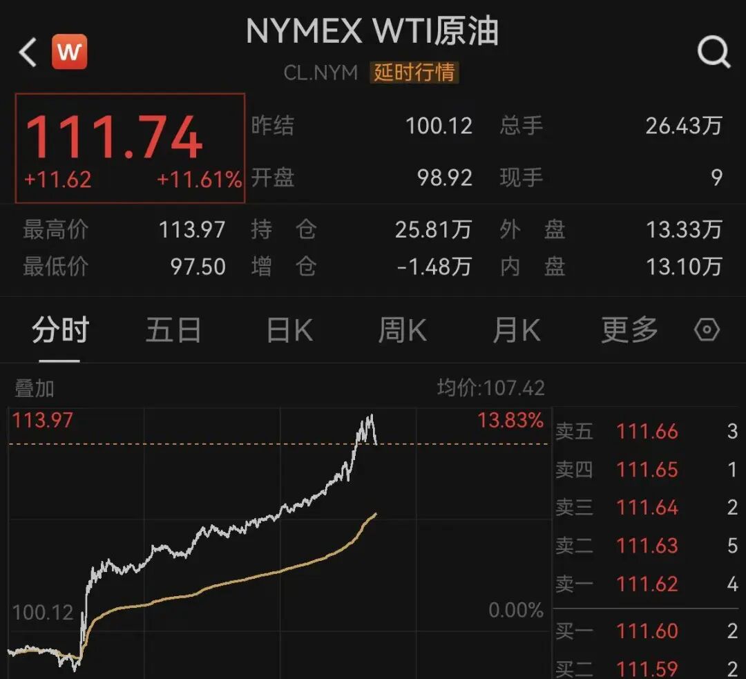 而原油直线暴涨,截至发稿,WTI原油涨逾11%。