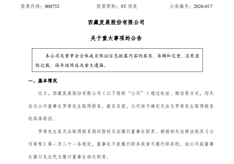公告显示,近日,ST西发(全称“西藏发展股份有限公司”)通过电话、微信等方式,均无法与公司董事长罗希取得联系。截至目前,公司尚不确定无法与罗希取得联系的具体原因。