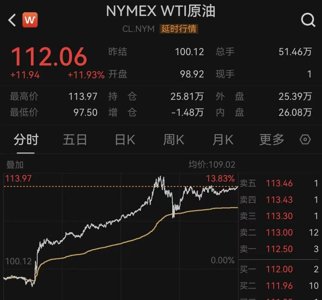 原油继续大涨,WTI原油最终收涨11.93%,每桶价格站上110美元。