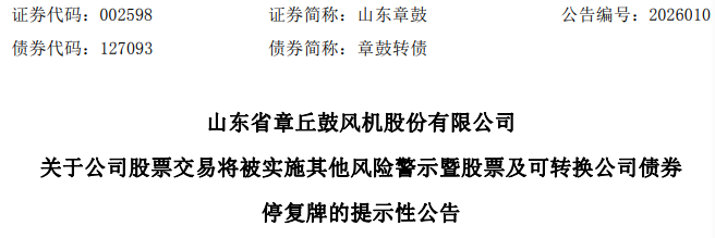 但根据相关规定,山东章鼓股票将自4月7日开市起停牌1天,自2026年4月8日开市起复牌。自4月8日开市起,山东章鼓将被实施其他风险警示,股票简称由“山东章鼓”变更为“ST章鼓”;股票交易日涨跌幅限制为5%。
