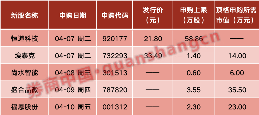 本周(4月7日—4月10日)有5只新股发行,周二:恒道科技、埃泰克;周三:尚水智能;周四:盛合晶微 ;周五:福恩股份。