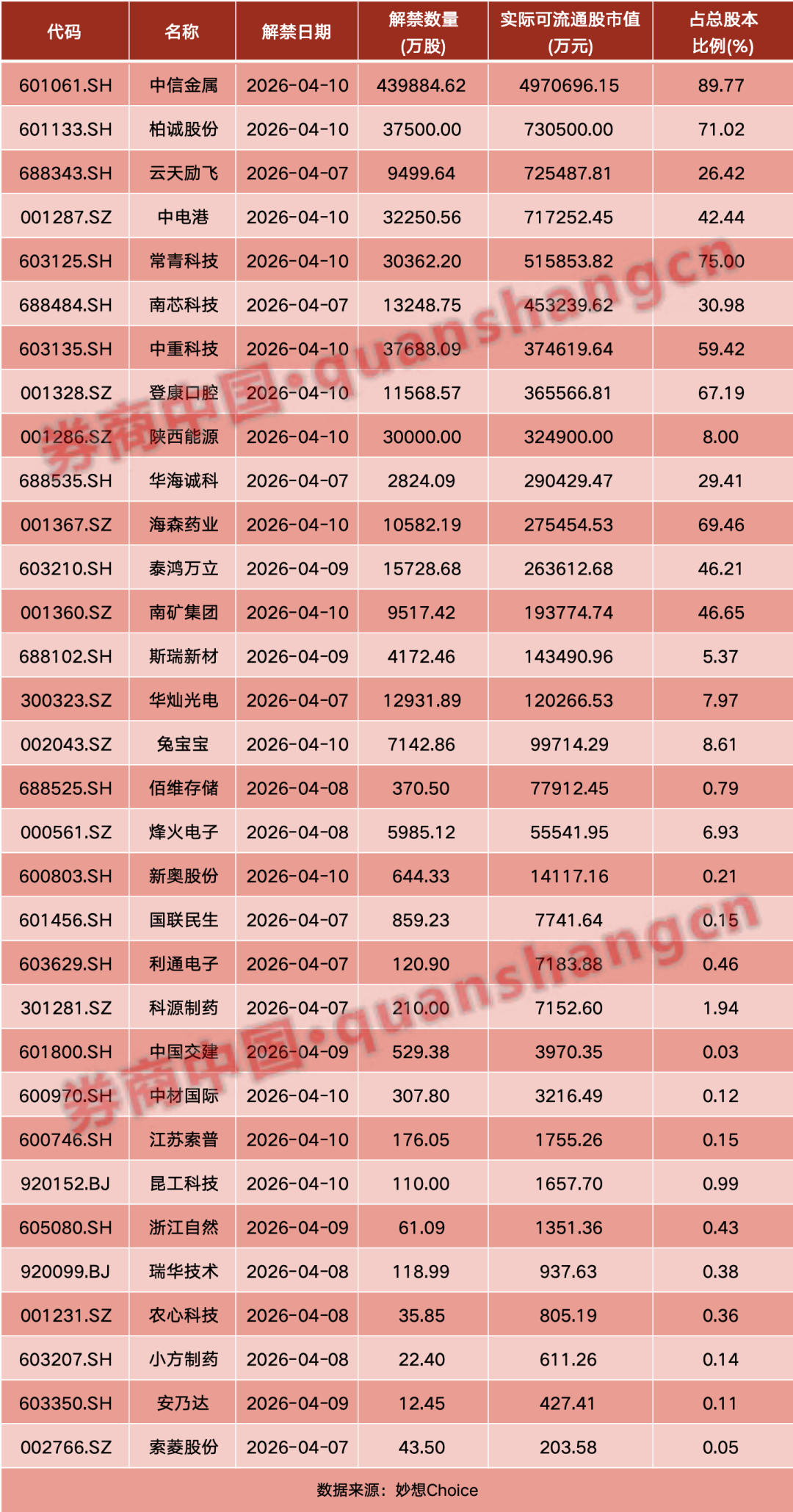 从解禁占比来看,居前三位的是:中信金属(89.77%)、常青科技(75%)、柏诚股份(71.02%)。