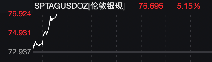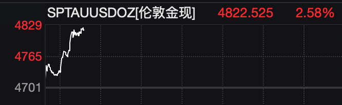 黄金、白银猛拉。截至发稿,国际现货黄金报价4822.525美元/盎司,涨幅为2.58%;现货白银报76.695美元/盎司,涨幅为5.15%。