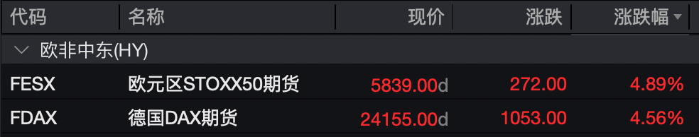 欧美指数期货也全线大涨。欧元区STOXX50期货、德国DAX期货均涨超4%。