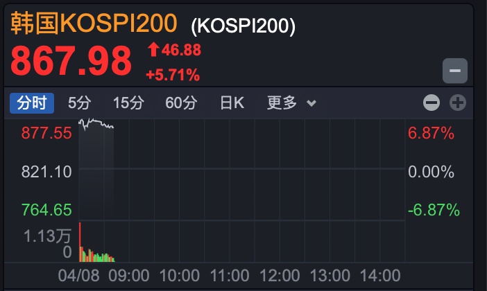 韩国KOSPI200期货上涨5%后启动指数熔断机制,程序化交易暂停5分钟。
