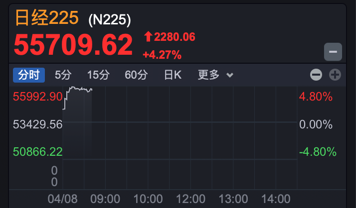 日经225指数涨幅扩大至超4%,现报55709.62点,日内涨近2300点。