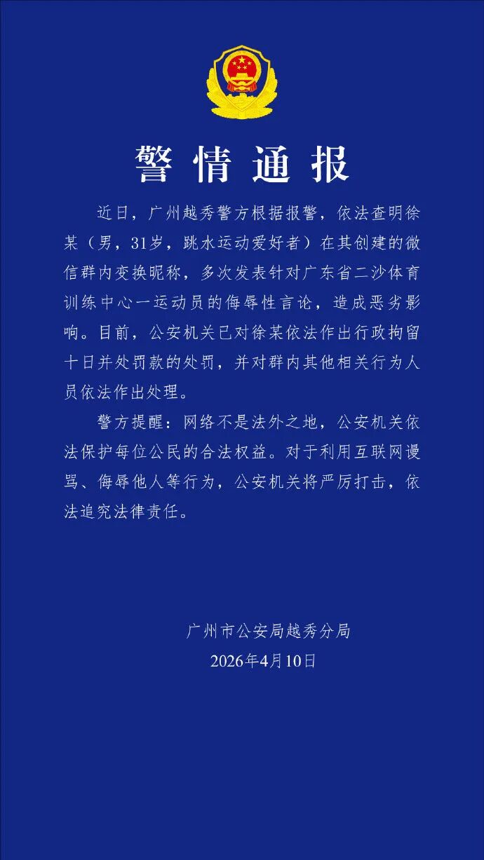 近日,广州越秀警方根据报警,依法查明徐某(男,31岁,跳水运动爱好者)在其创建的微信群内变换昵称,多次发表针对广东省二沙体育训练中心一运动员的侮辱性言论,造成恶劣影响。目前,公安机关已对徐某依法作出行政拘留十日并处罚款的处罚,并对群内其他相关行为人员依法作出处理。