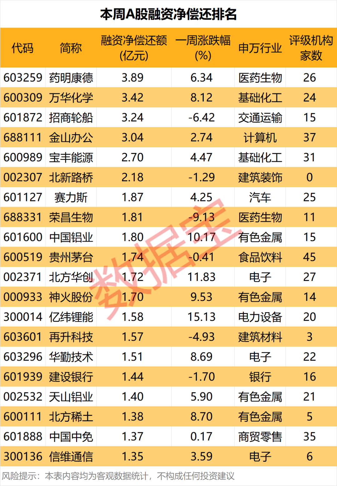 33股遭融资净偿还额超过1亿元。药明康德、万华化学、招商轮船、金山办公净偿还额均超过3亿元,分别为3.89亿元、3.42亿元、3.24亿元、3.04亿元;宝丰能源、北新路桥融资净偿还额在2亿元以上。