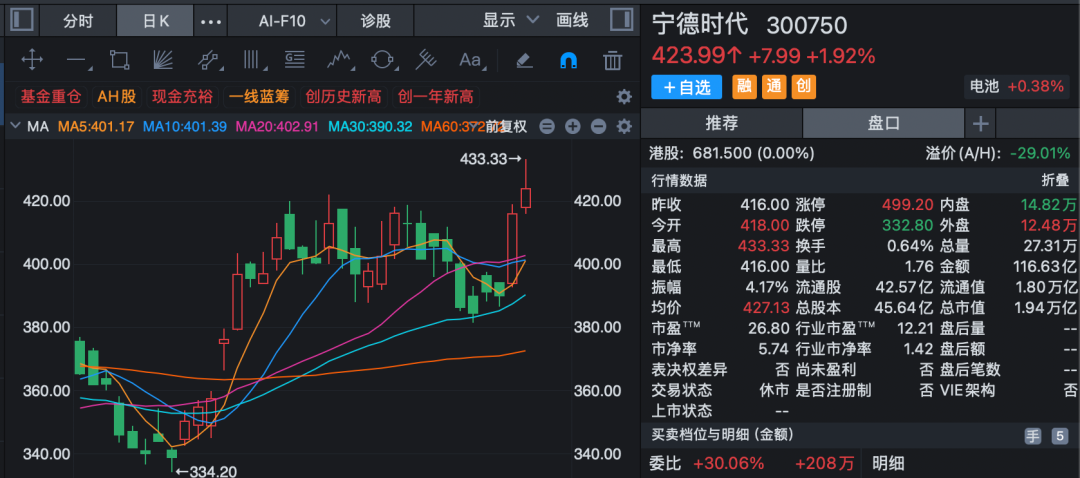 宁德时代AH早间联袂创历史新高(复权),A股一度大涨逾4%,每股最高摸至433.33元;H股一度突破700港元/股,AH市值合计近2万亿元。