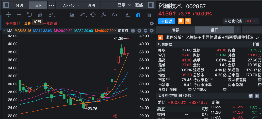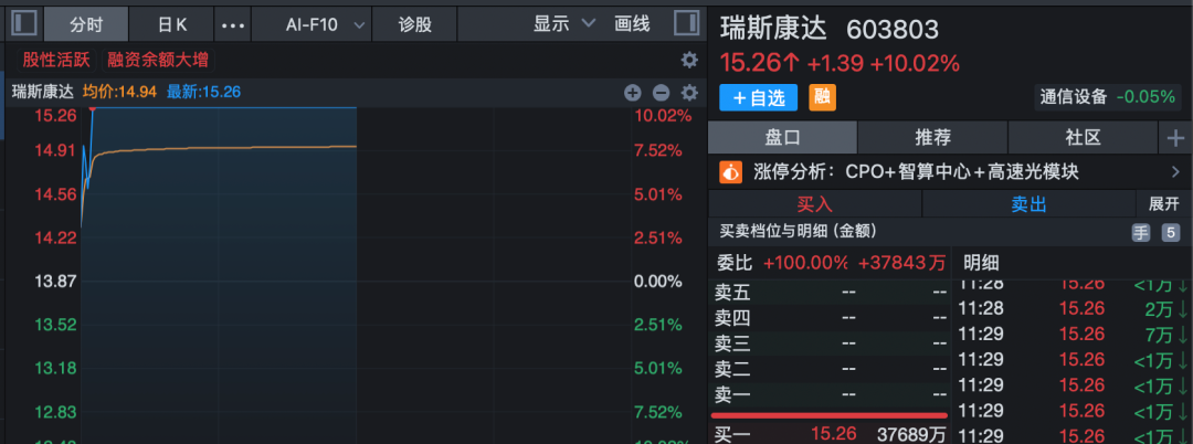CPO概念早间低开高走,板块指数再创历史新高,瑞斯康达开盘仅约4分钟直线涨停,华盛昌也仅约10分钟封板,今年以来飙升逾176%,科瑞技术则5日3涨停,红板科技、优迅股份、泰晶科技等纷纷涨停或涨超10%。