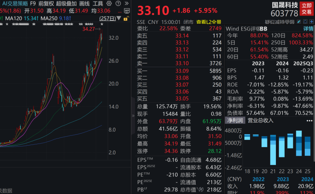 国晟科技是光伏产业大牛股之一,2025年11月25日至今,公司股价累计上涨309.15%,最新价33.1元/股,总市值218.47亿元。