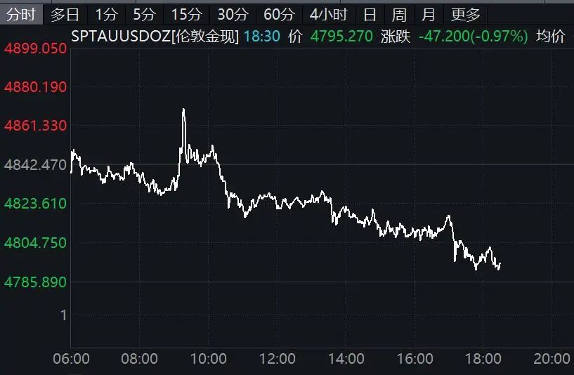 国际黄金跳水,现货黄金向下跌破4800美元/盎司,跌幅近1%。现货白银跌超1%。