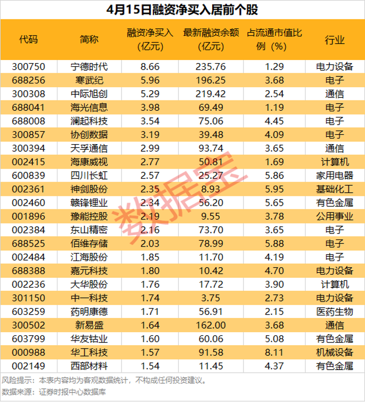 具体到个股,4月15日共有1920股获融资净买入,净买入金额在1亿元以上的有40股,其中6股融资净买入额均超3亿元。