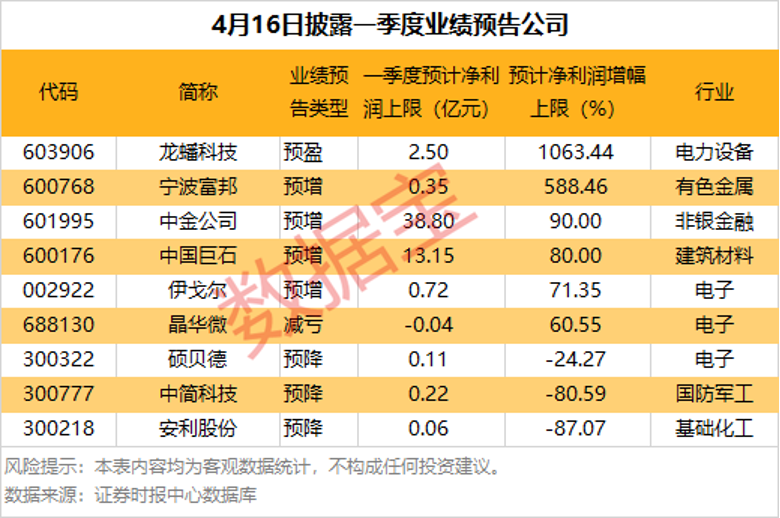 一季度业绩预告密集披露,今日公布业绩预告的有9家。龙蟠科技(603906)、宁波富邦(600768)等预计一季度净利润大幅增长的公司早盘强势涨停。
