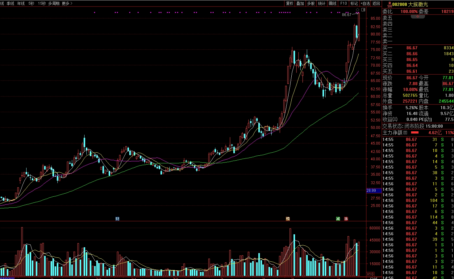 人民财讯4月16日电,4月16日,大族激光涨停,股价创历史新高,全天成交金额42.6亿元,盘后数据显示,活跃游资国泰海通证券武汉紫阳东路证券营业部买入1.13亿元;另外,有多家机构现身其龙虎榜的买卖方。中钨高新今天也涨停,全天成交金额61.3亿元,国泰海通证券武汉紫阳东路证券营业部买入1.28亿元。