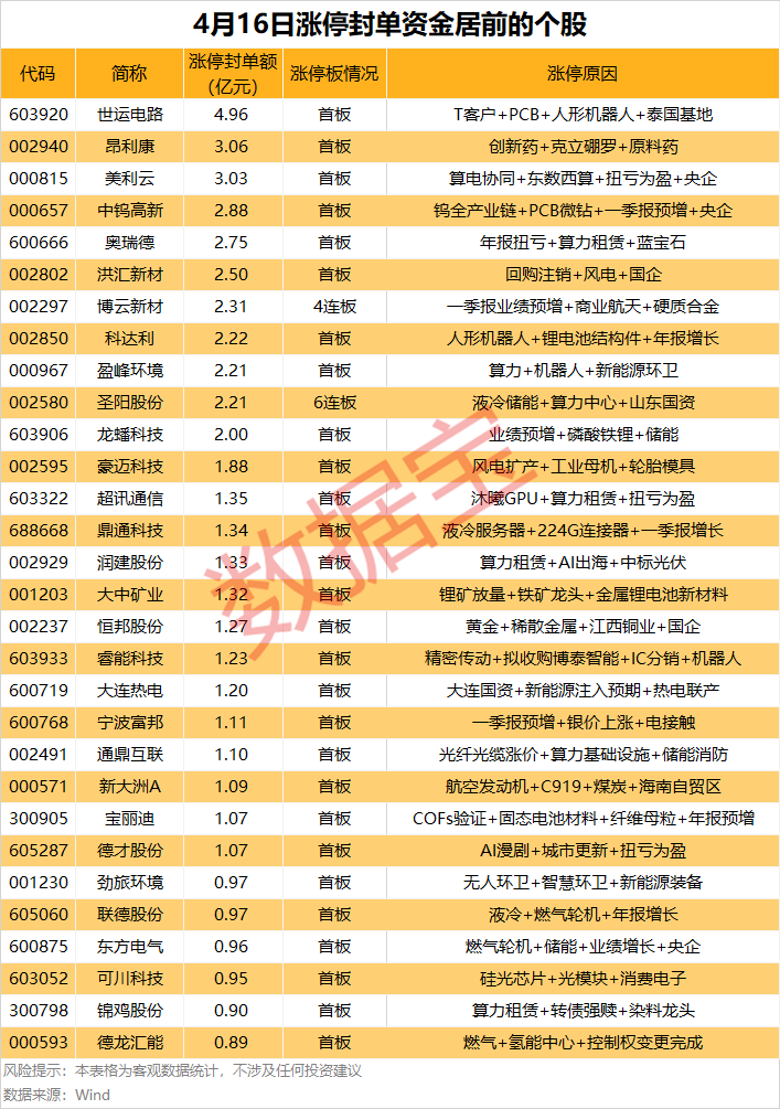 从连续涨停天数看,圣阳股份已连收6个涨停板,连续涨停板数量最多。以封单金额计算,11股封单金额在2亿元及以上,世运电路、昂利康、美利云等涨停板封单资金居前,分别有4.96亿元、3.06亿元、3.03亿元。