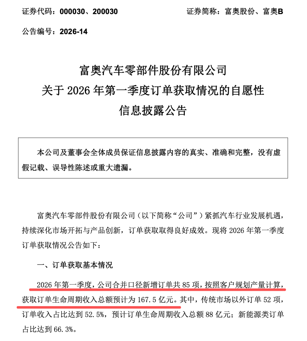 富奥股份(000030)4月16日晚公告:2026年第一季度,公司合并口径新增订单共85项,按照客户规划产量计算,获取订单生命周期收入总额预计为167.5亿元。其中,传统市场以外订单52项,订单收入占比达到52.5%,预计订单生命周期收入总额88亿元;新能源类订单占比达到66.3%。