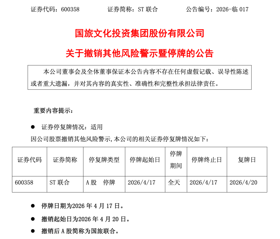ST联合(600358)4月16日晚公告,上交所同意撤销公司股票其他风险警示。根据相关规定,公司股票将于4月17日停牌一天,自4月20日起复牌交易;公司股票撤销其他风险警示后,A股简称由“ST联合”变更为“国旅联合”,证券代码仍为600358。撤销其他风险警示后,公司股票转出风险警示板交易,股票交易日涨跌幅限制由5%变为10%。
