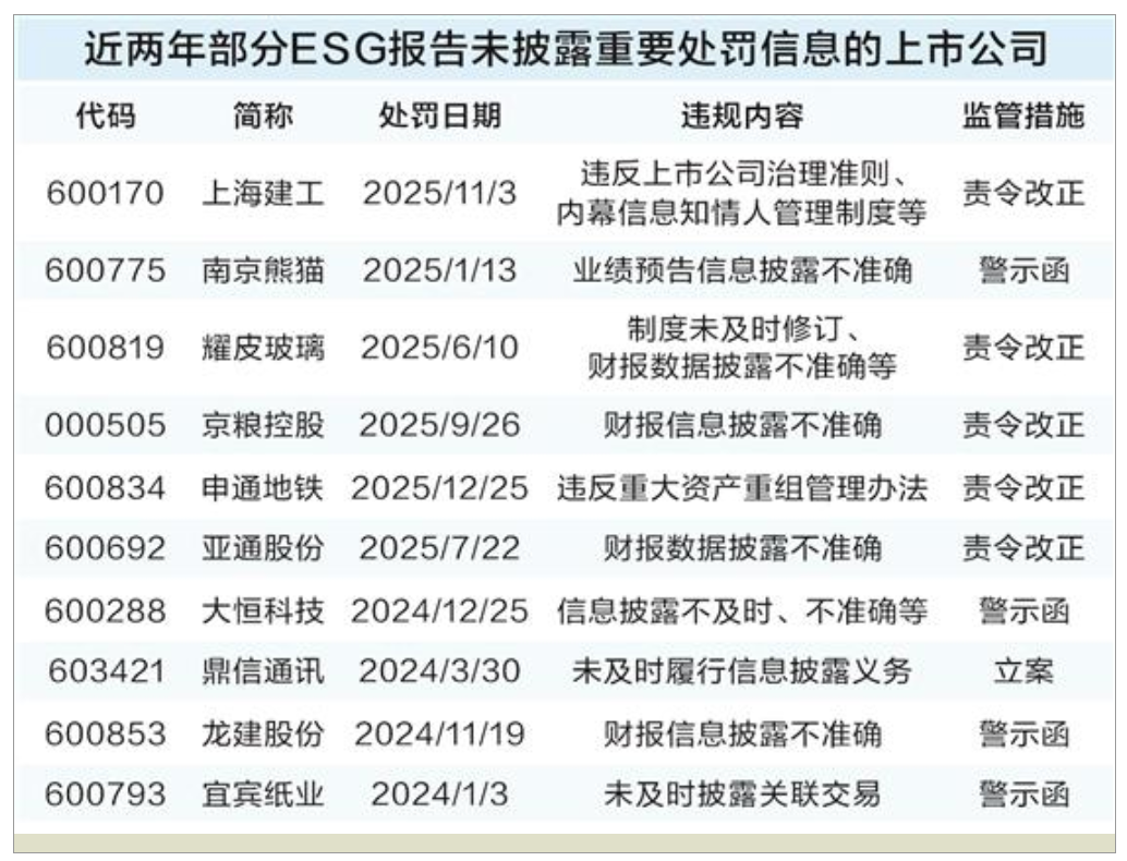 例如2025年1月南京熊猫因业绩预告与实际业绩差异较大、净利润盈亏性质发生变化的信息披露不准确事项被出具警示函;2025年9月京粮控股因子公司开展的贸易无商业实质或收入确认不符合会计准则规定被责令改正,相关信息均未在ESG报告中体现。