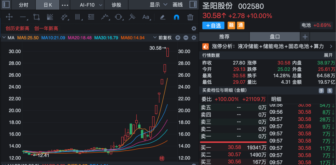电池产业链反复活跃,圣阳股份(002580)实现7连板,龙蟠科技、天华新能、石大胜华、万润新能纷纷上扬。