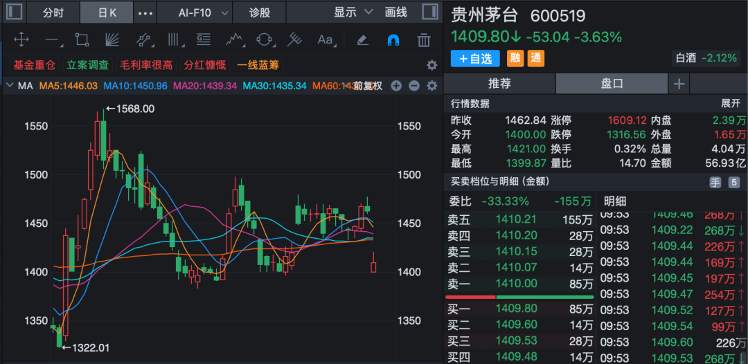 盘初,贵州茅台跌超3%。迎驾贡酒、惠泉啤酒、金徽酒等股跟跌。