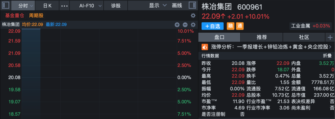 消息面上,株冶集团发布第一季度财报显示,归属于上市公司股东的净利润11.44亿元,同比增长313.00%;归属于上市公司股东的扣除非经常性损益的净利润11.98亿元,同比增长323.42%。业绩变动主要系稀贵金属和硫酸价格上涨,收入增加,创效增加。