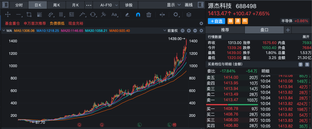 早盘,源杰科技持续走强,股价冲高至1439元/股,盘中超越贵州茅台成为A股新“股王”。自2025年4月以来,源杰科技累计涨超11倍。