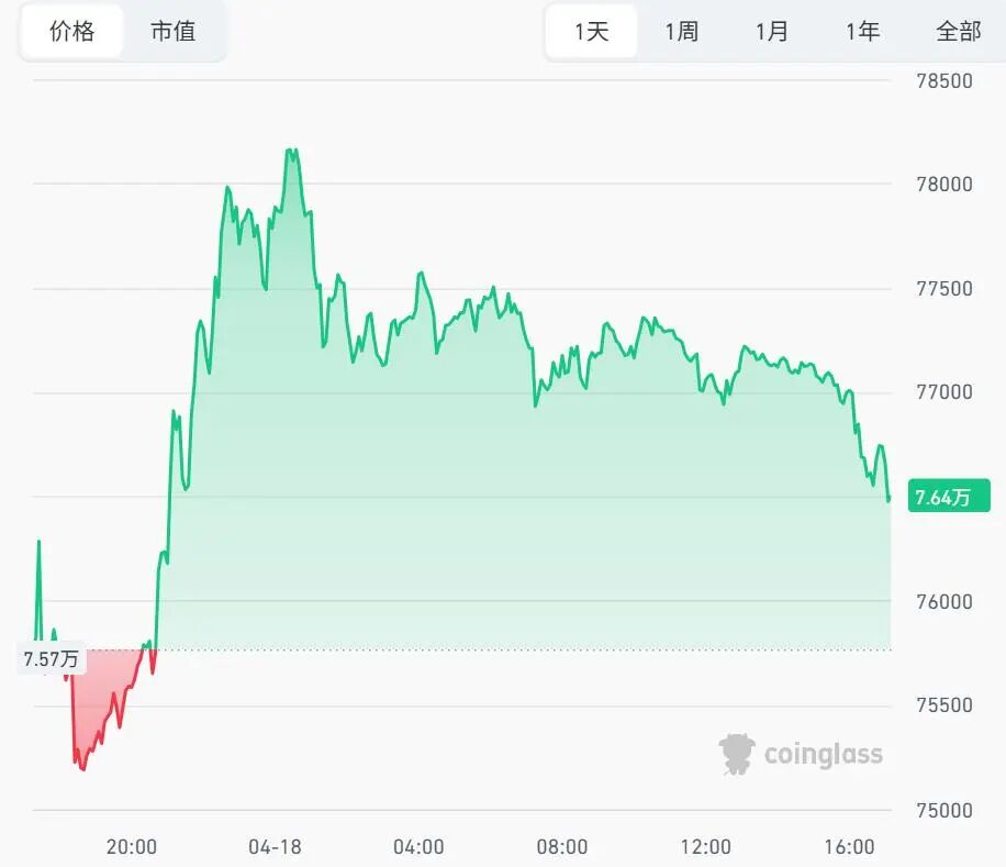 在昨日全线拉升后,加密货币4月18日集体震荡回落,比特币一度回落至77000美元下方。根据CoinGlass数据统计,最近24小时,全球共有超15万人爆仓。