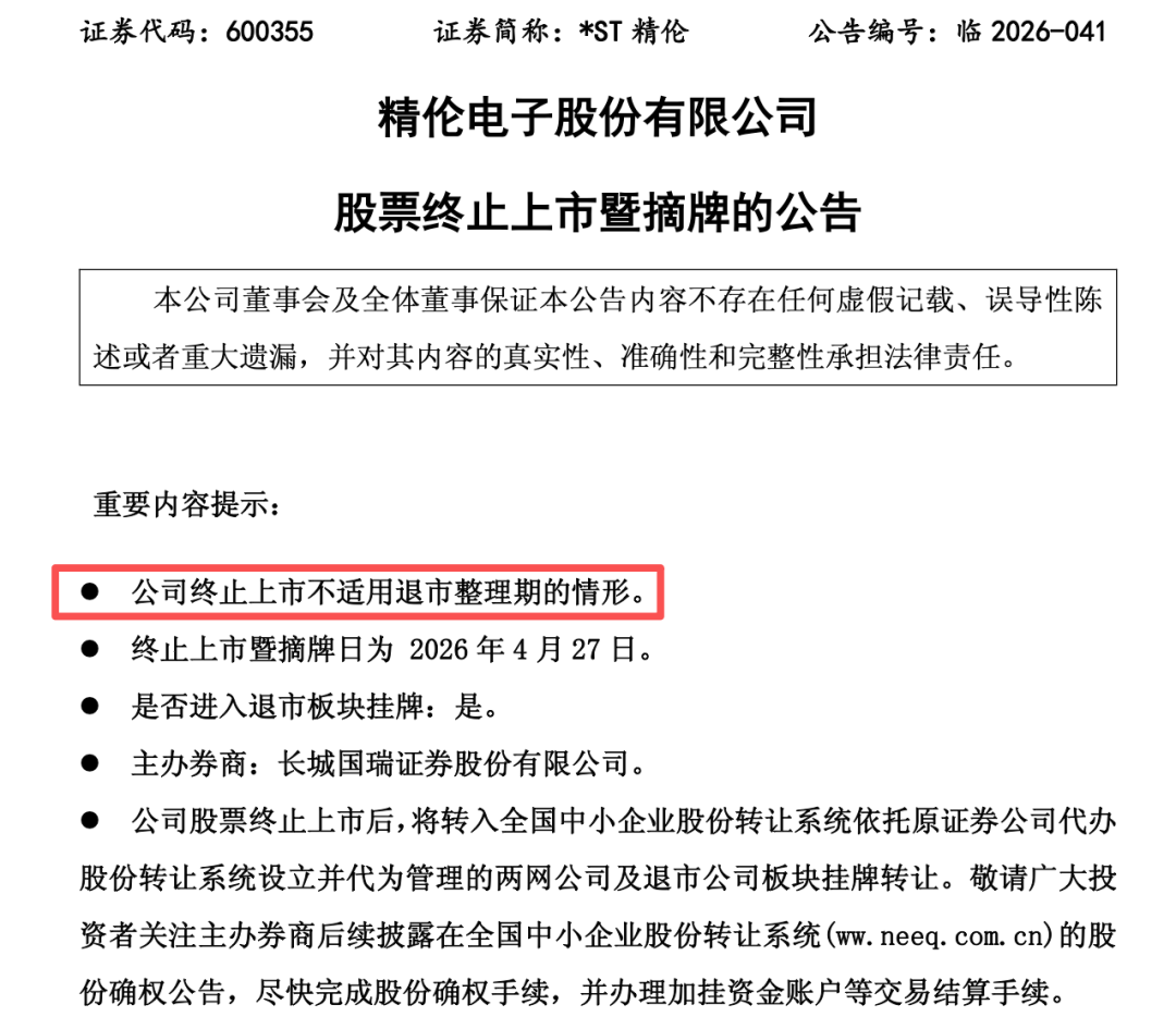 4月20日,*ST精伦(600355)收到上交所出具的决定书:上交所决定终止公司股票上市。*ST精伦股票将于2026年4月27日终止上市暨摘牌,同时交易类强制退市公司股票不进入退市整理期交易。