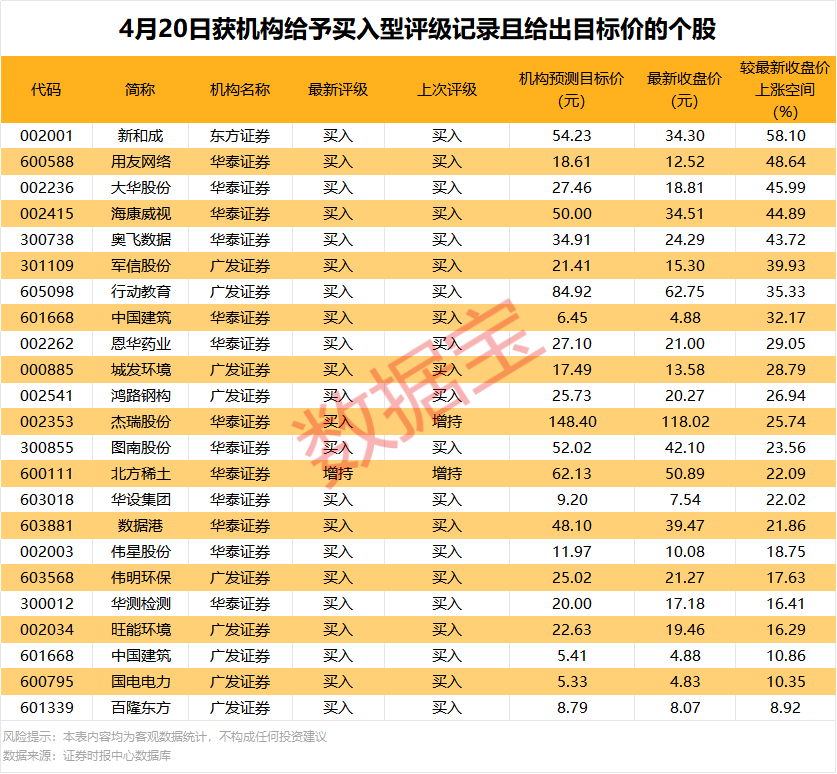 新和成上涨空间最高,4月20日东方证券预计公司目标价为54.23元/股,上涨空间达58.1%;上涨空间较高的个股还有用友网络、大华股份等,上涨空间分别为48.64%、45.99%。